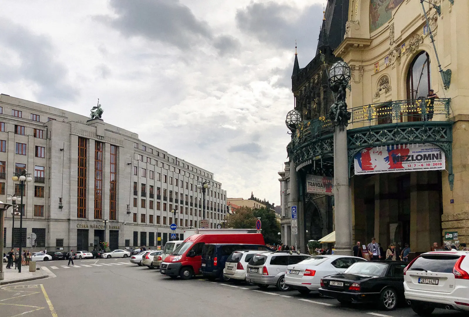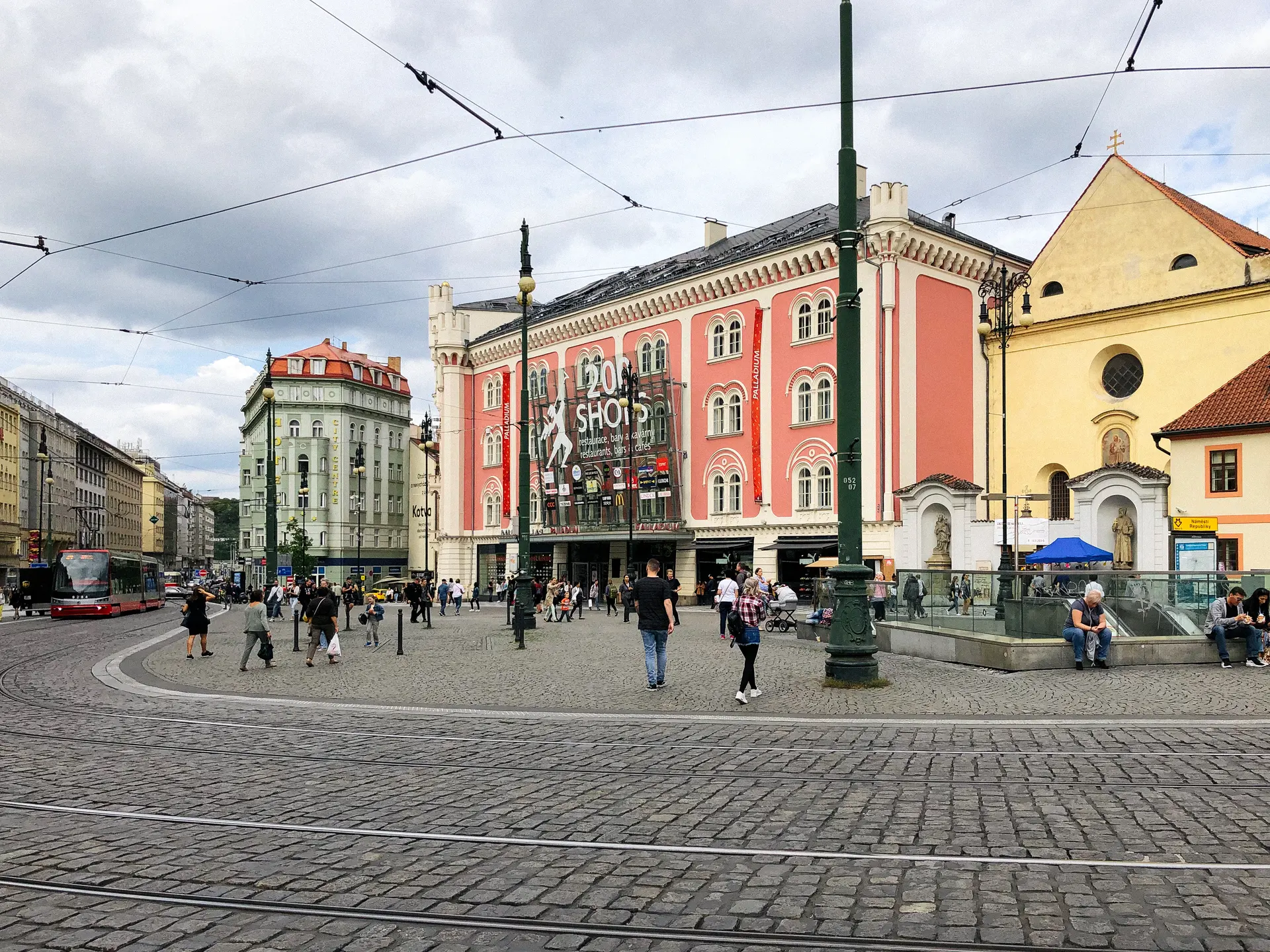 For those preferring to travel by car, it’s possible to park in the paid parking garages of Kotva or Palladium shopping malls. If you are lucky, you can park your car in one of the adjacent streets with parking for residents only.